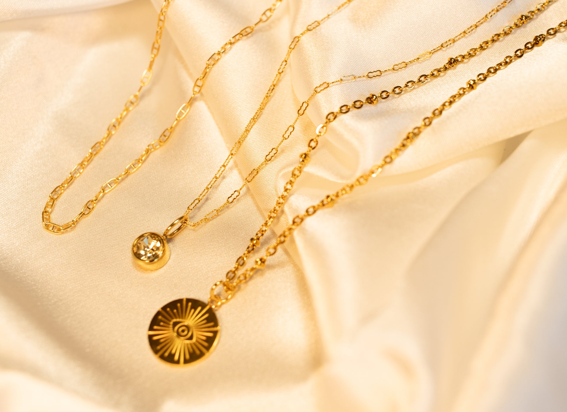 Our evil eye pendant is paired with a satellite chain for a beautiful necklace that you can wear day to day or pair with one of our essential chains for a gorgeous necklace stack.