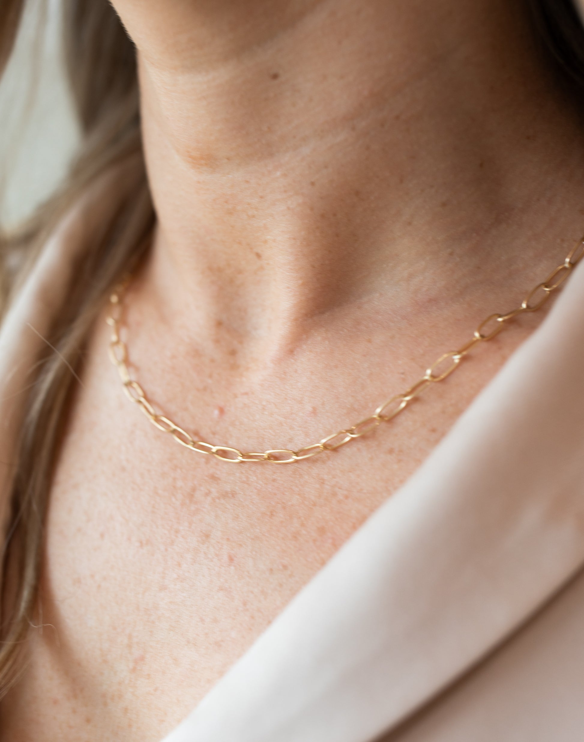 14k paper chain necklace with drawn cable chain.